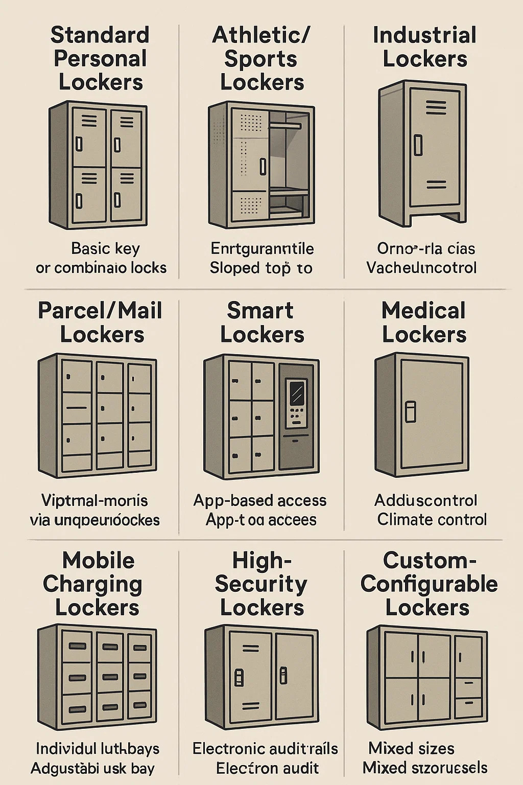 ล็อกเกอร์ได้รับการจัดหมวดหมู่ตามการออกแบบ ฟังก์ชัน และบริบทการใช้งาน ด้านล่างนี้คือรายละเอียดประเภททั่วไป: